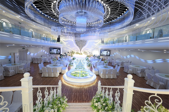 喜事匯酒店,五號宴會廳-水晶廳以"星辰夢境"為設計靈感,將現代藝術與自然美學結合。全廳采用無柱式設計,通透空間可容納29桌賓客。頂部懸掛璀璨燈飾,光影流轉間如銀河傾瀉,搭配流線型裝飾墻,營造出360°沉浸式光影體驗,讓每個瞬間都閃耀非凡。該宴會廳自帶高雅精致的場景布置,從燈光到裝飾皆經過設計,無需額外聘請婚慶公司進行場布,即可呈現如夢似幻的浪漫氛圍,讓新人省心省力,享受美麗婚禮。